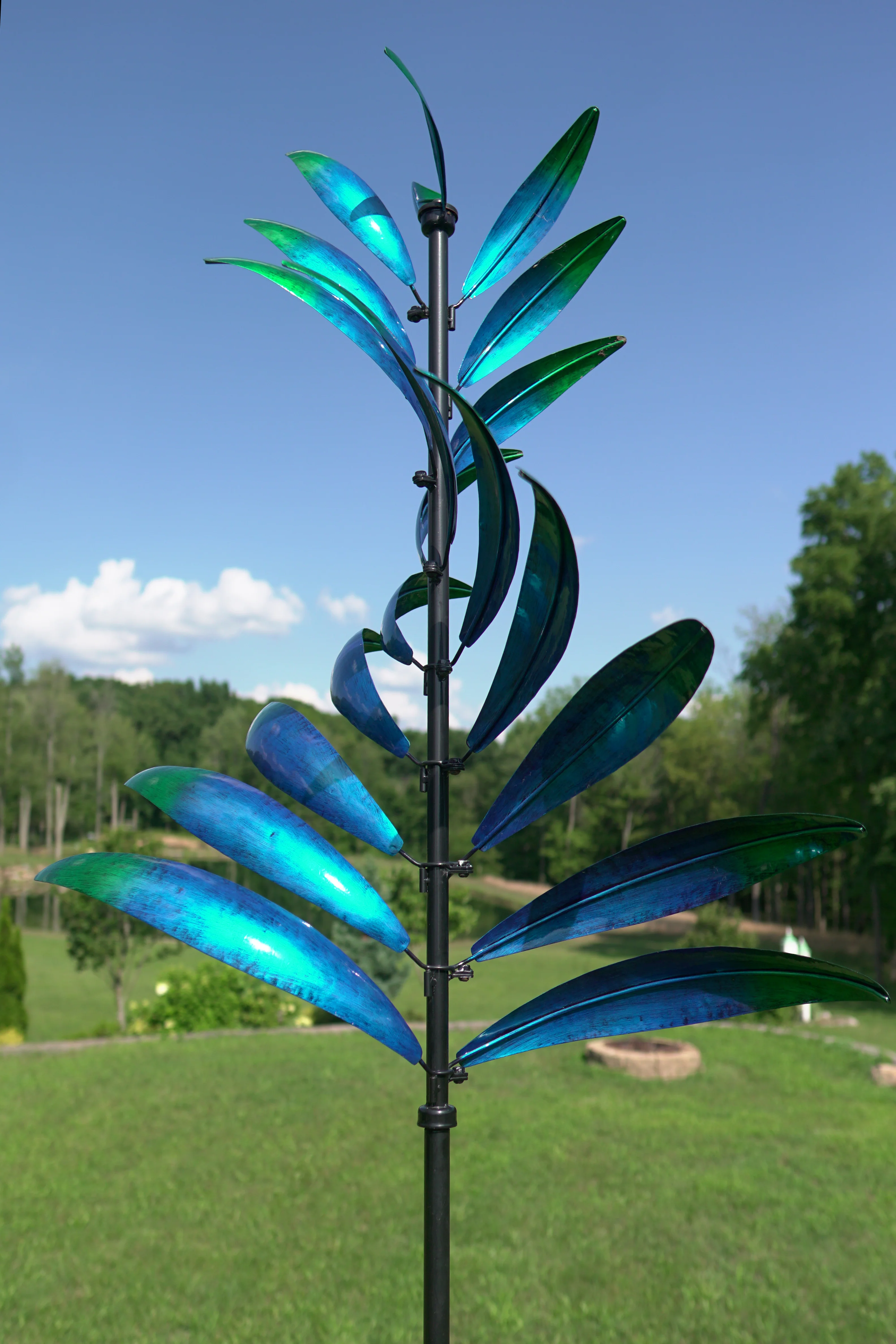 As the wind spins this metal art, you can show off your creativity and create a beautiful display in your yard.