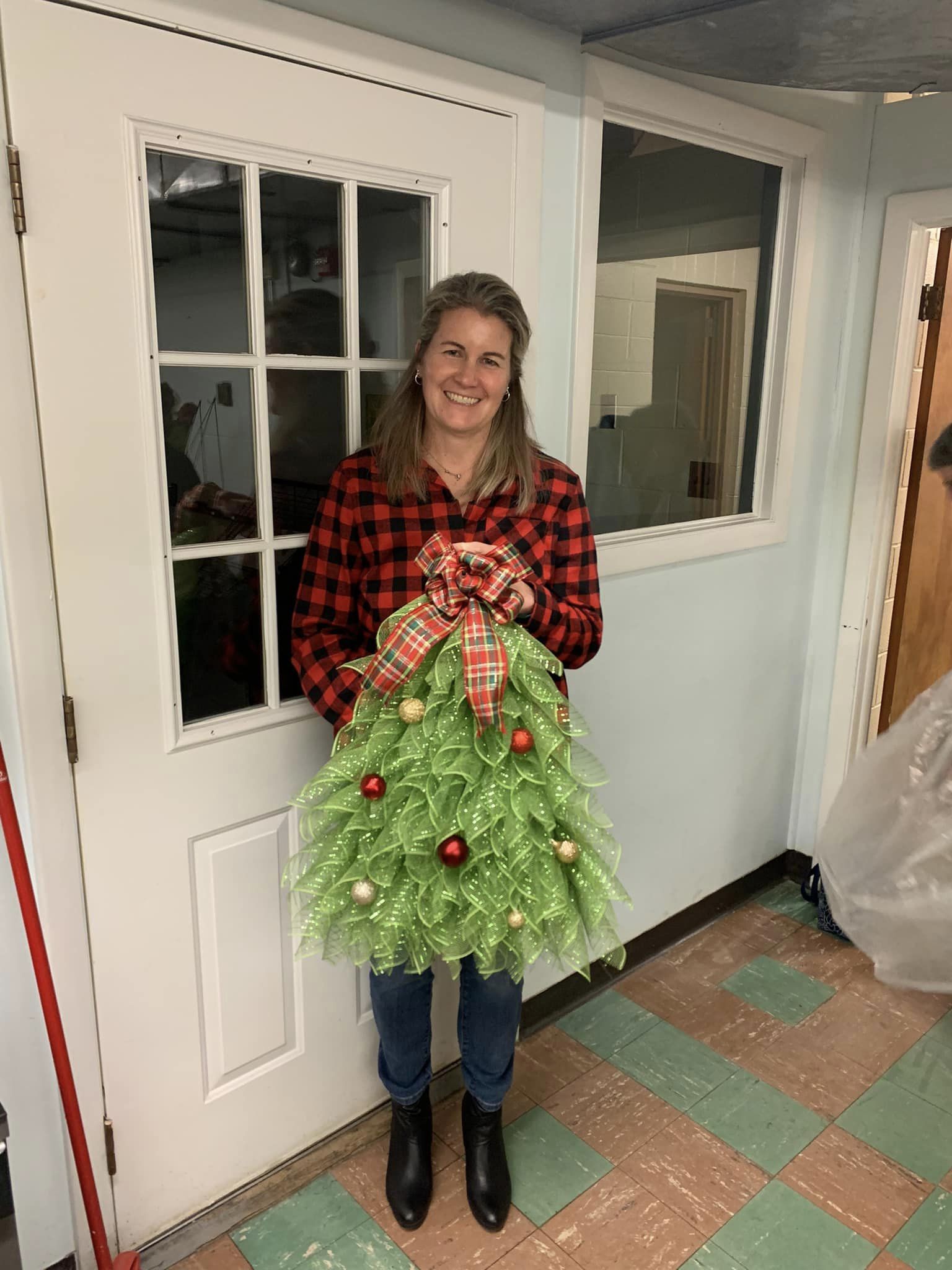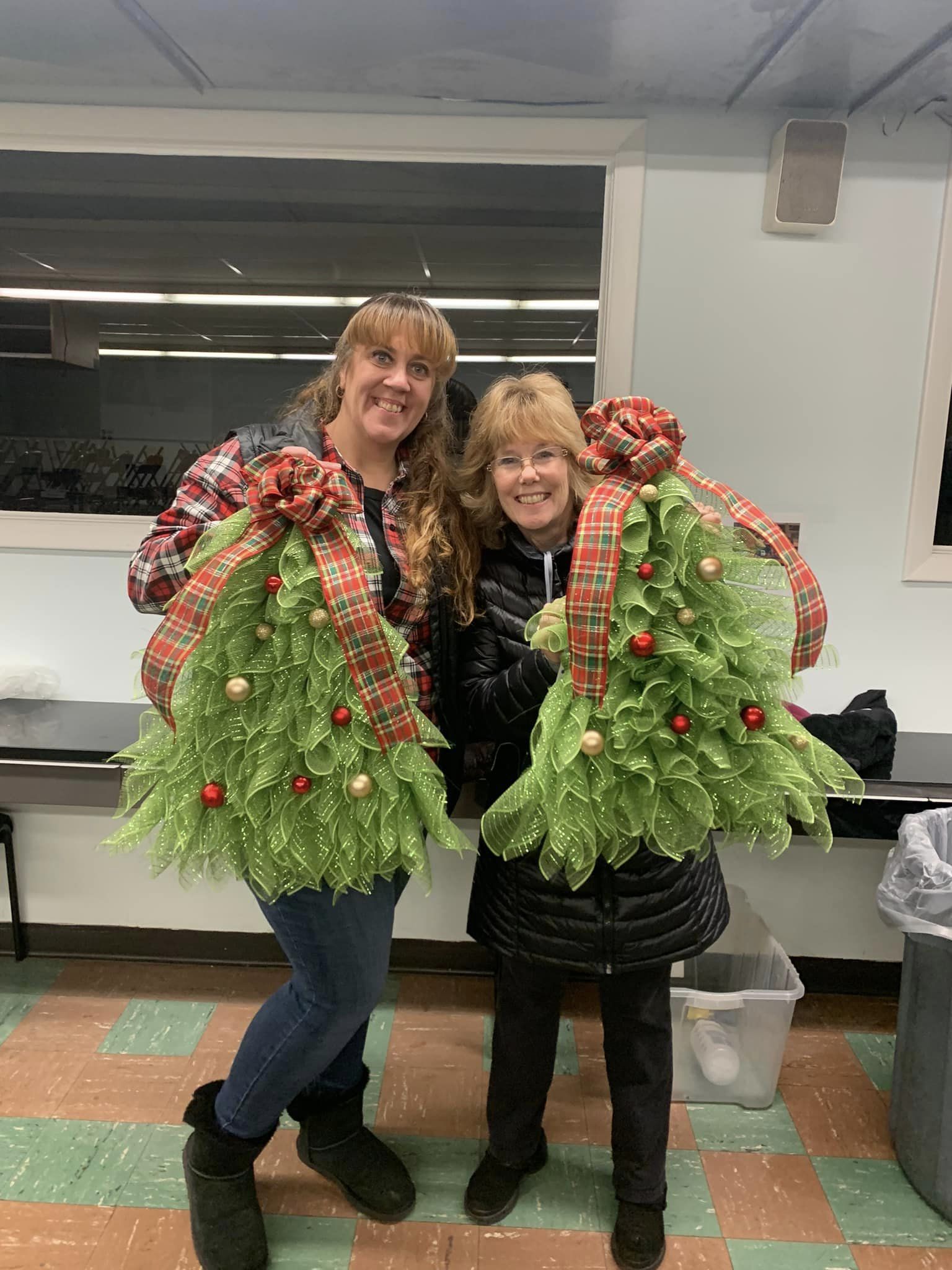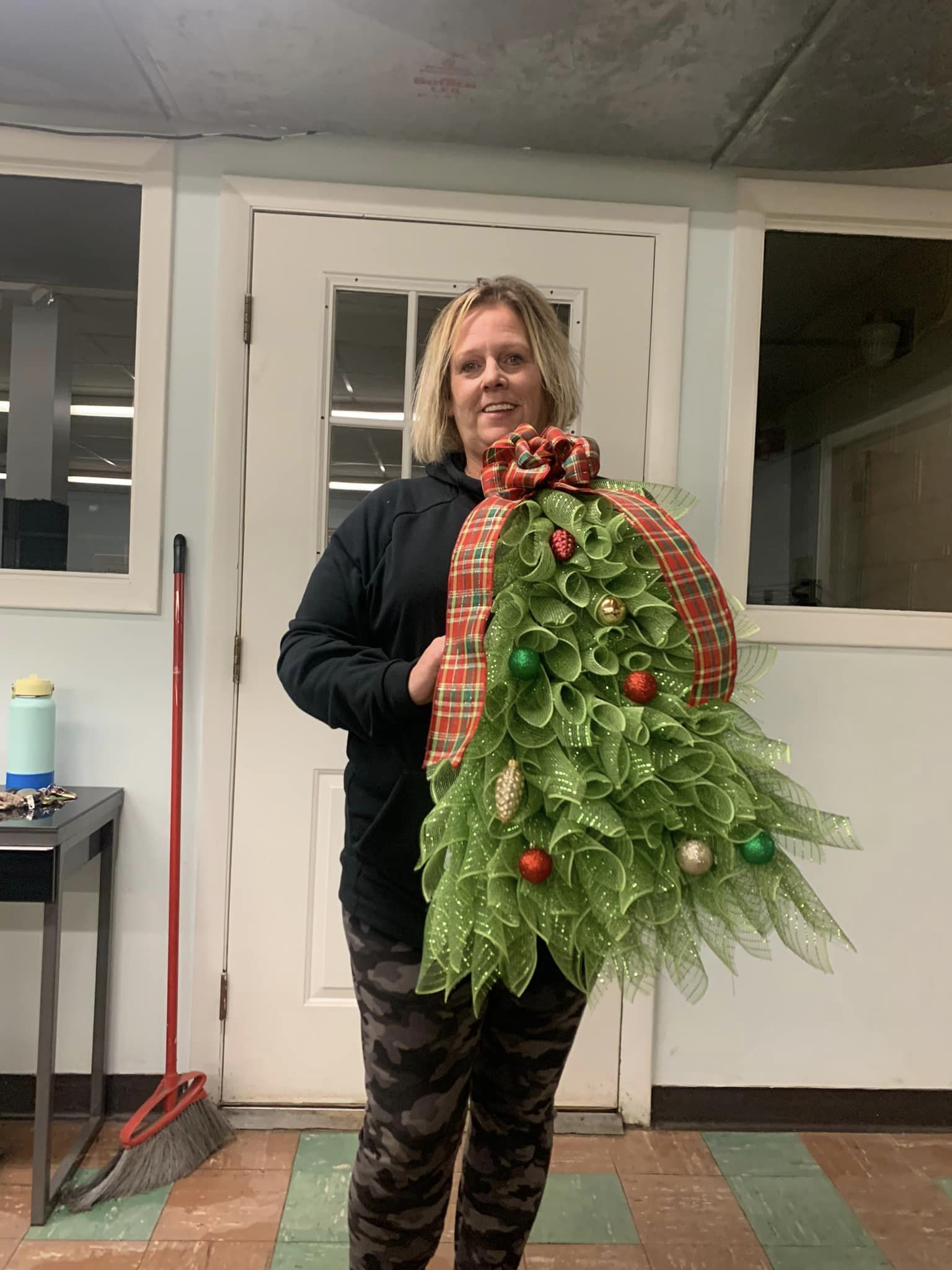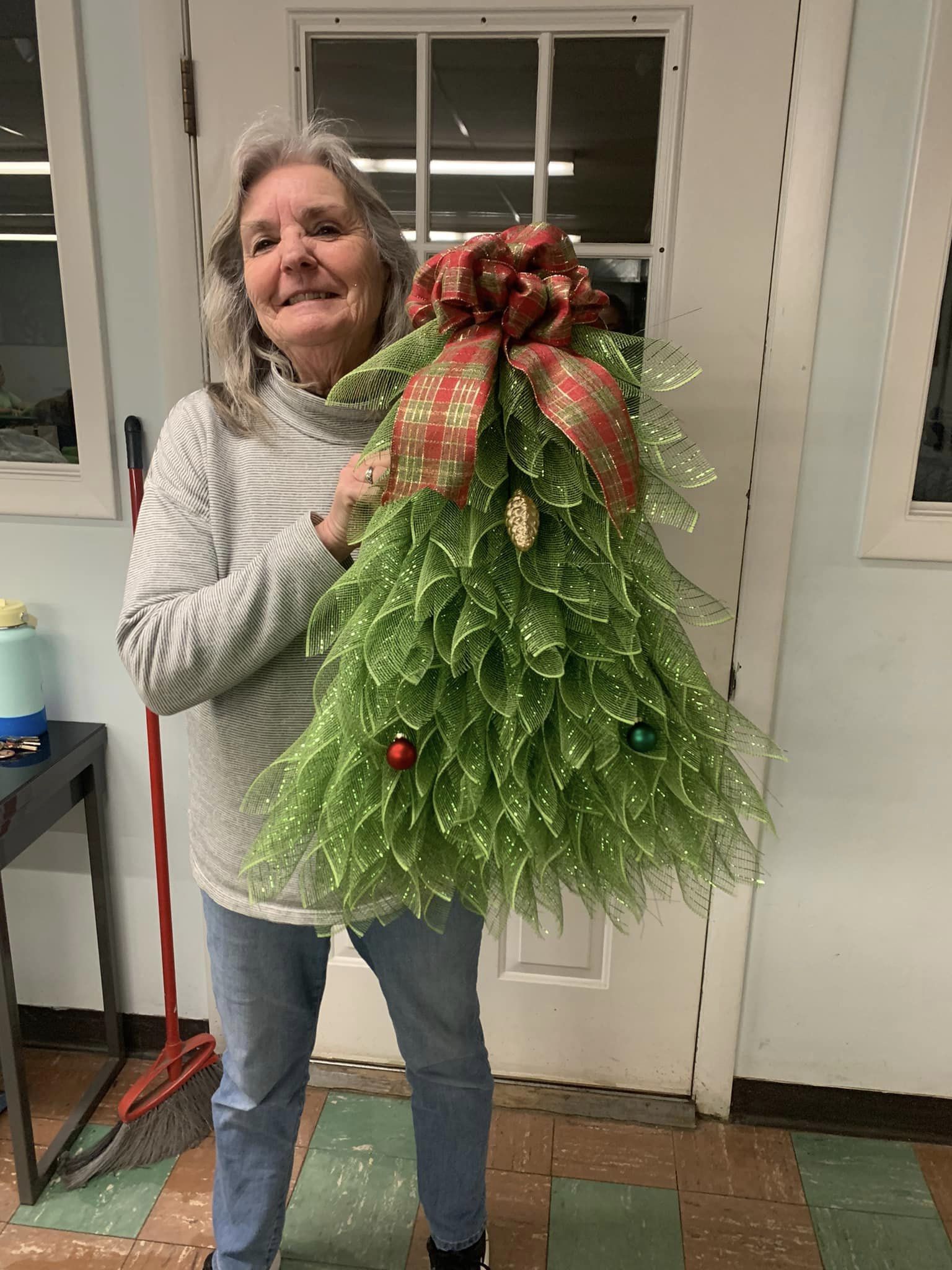 The Christmas tree body is made of green polyester burlap netting. The bow topper is red, and green polyester burlap netting. (Red, Green, Gold)Berry accents and a cute bow with the Christmas tree decoration complete the look.
