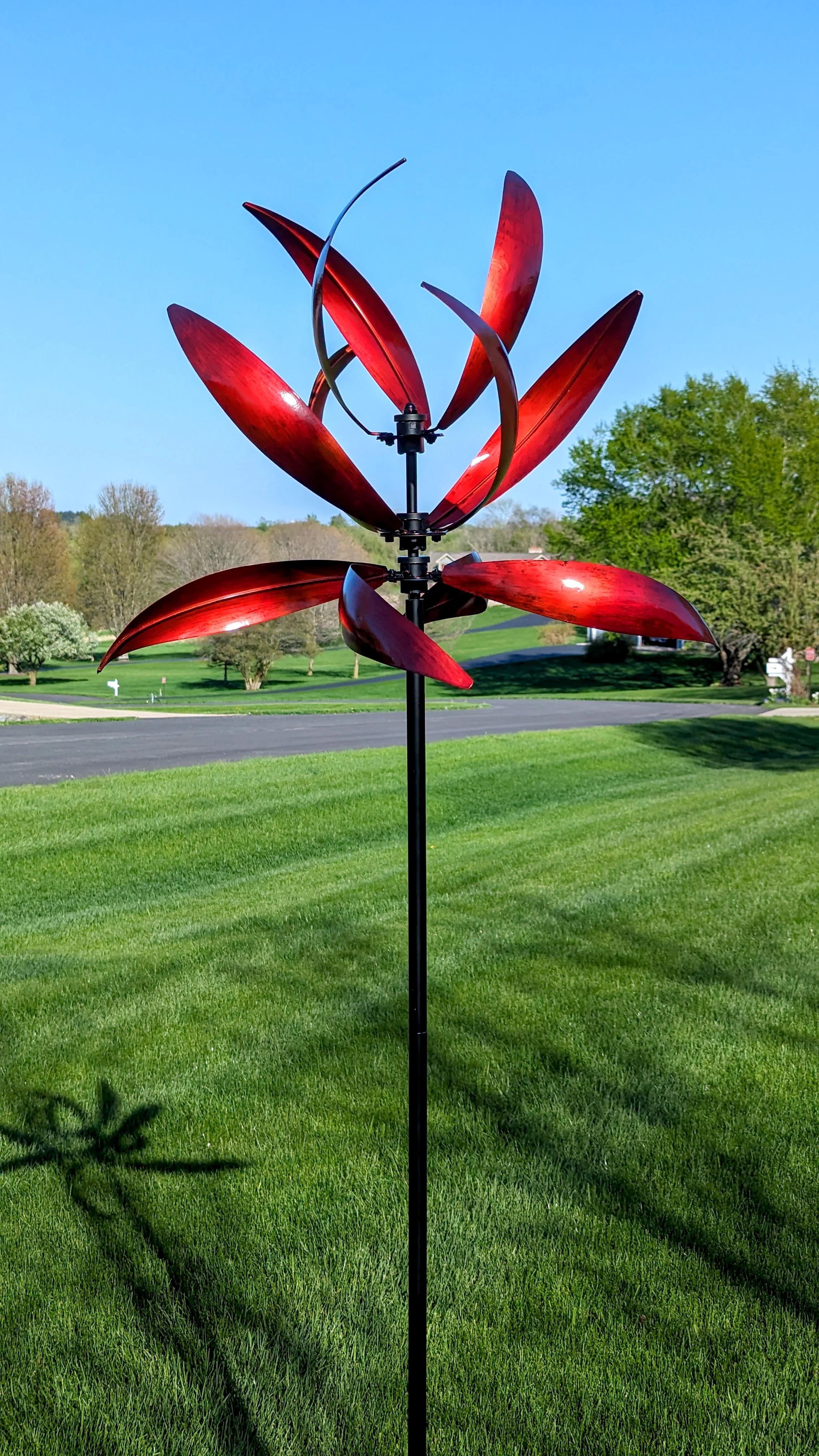 As the wind spins this metal art, you can show off your creativity and create a beautiful display in your yard.